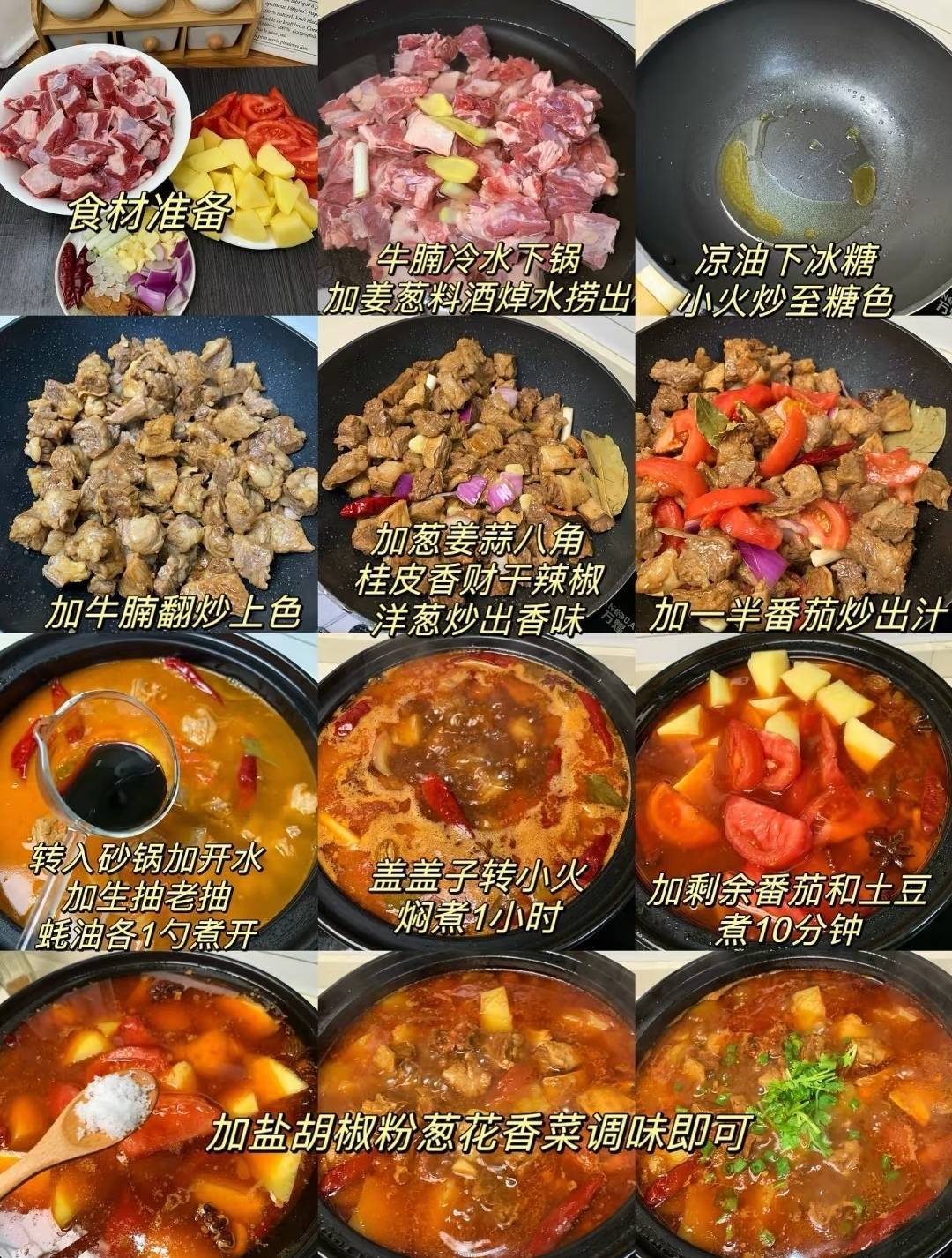 5. 放入番茄块,加盐和糖调味,再炖15分钟即可。牛肉软烂,汤汁拌饭一流。